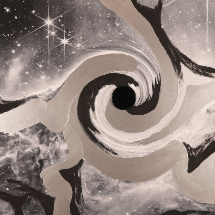 "Schwarzes Loch 1 (silber-schwarz)", Acryl auf Alu-Dibond, Digitalprint, Kunststoff, lackierter Holzträger, 30,0 x 30,0 x 6,4 cm, 2025